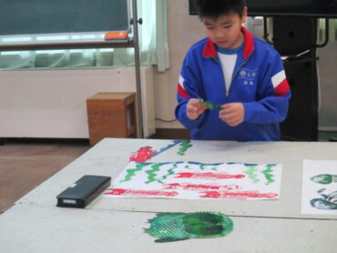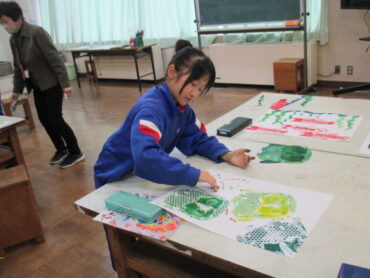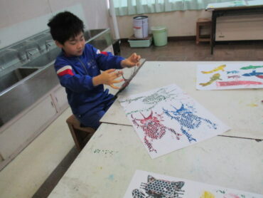 3年生は、図画工作の時間でした。紙版画「うつしてふえるよでこぼこさん」の学習で、刷りの時間でした。同じ形の土台の色を変えて