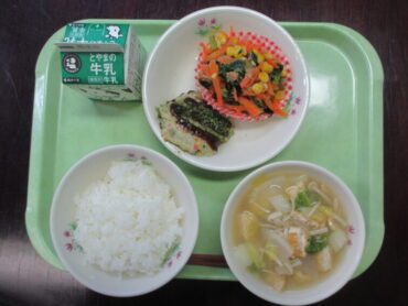 ごはん、牛乳、高岡流お好み焼き「ととまる」、にんじんしりしり、大根のみそ汁