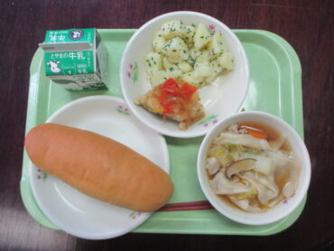 コッペパン、牛乳、さわらのマリネ、こふきいも、ワンタンスープ