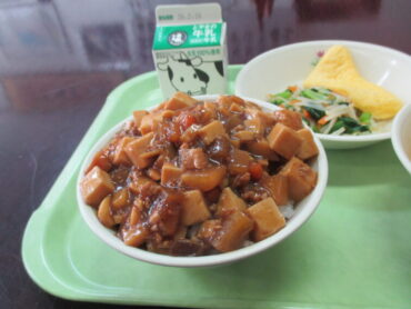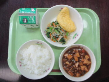 高岡野菜のマーボー丼、牛乳、オムレツ、もやしのナムル