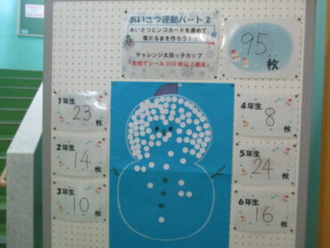シールは95枚集まりました。名前を呼んで、明るい声で挨拶できる子供たちが増えてきています。目標の200枚を目指して、みんなで明るい挨拶をしてほしいと思います。