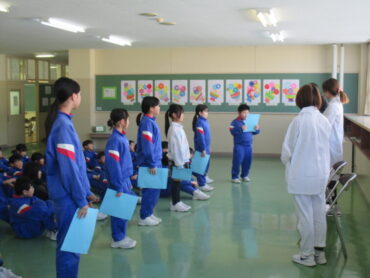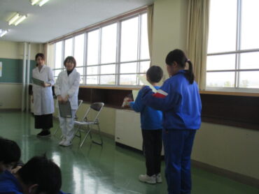 学年の代表者が、栄養士さんや調理員さんに手紙を読み、からだ委員会の2人が全校のみんなの手紙を渡しました。