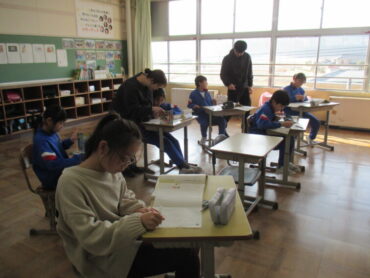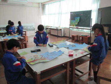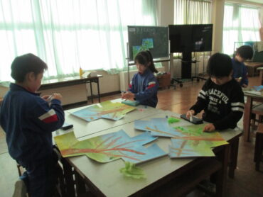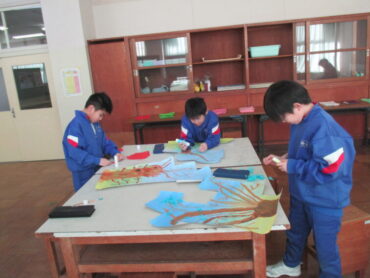 3年生は、図画工作の時間でした。卒業や入学をお祝いする作品を作っていました。伸びやかに描いた木に、色ちり紙で葉や花、実等を付けていました。