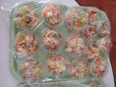 誕生月の子供たちや先生方が続々とランチルームにやってきました。誕生ランチのメニューは、カレーピラフ、鶏肉のマーマレードソースがけ、ビーフンソテー、卵とコーンのスープ、豆乳プリンでした。