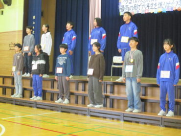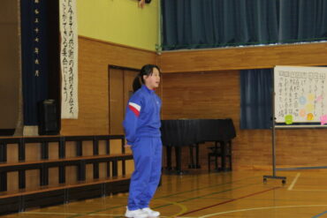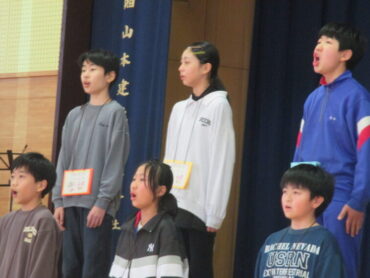 6年生の子供たちから、お返しの歌として「翼をください」が贈られました。心を込めて開いてもらった祝う会への感謝、そして中学校でも大きく羽ばたきたいという決意——その気持ちを乗せて歌う姿は、まっすぐで、胸を打つものでした。プロジェクターには、在校生へのメッセージが映し出され、会場は温かい空気に包まれました。