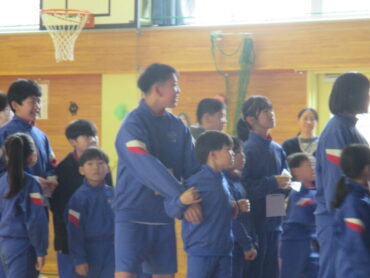 6年生の子供たちから、お返しの歌として「翼をください」が贈られました。心を込めて開いてもらった祝う会への感謝、そして中学校でも大きく羽ばたきたいという決意——その気持ちを乗せて歌う姿は、まっすぐで、胸を打つものでした。プロジェクターには、在校生へのメッセージが映し出され、会場は温かい空気に包まれました。