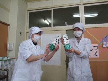 牛乳は、いつものパックよりも大きい1リットルサイズのものから、「卒業おめでとう!」とシールが貼ってある紙コップに調理員さんが注いでくれました。