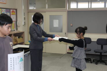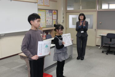 3月5日(木)、授賞式と委員会引き継ぎ式を行いました。第67回富山県小・中・高校生書き初め大会、第64回小学生図画コンクール「わたしのママ・パパをかきましょう」で入賞した子供たちを代表して、二人の子供に賞状を渡しました。