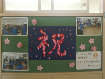 また、6年生の教室前掲示板には、以前に命の授業をしてくださった松嶋先生からいただいた折り鶴を使って、先生方が作った掲示物もありました。この折り鶴は、松嶋先生が病室やご自宅、学校等で「回復の願い、周りの人への感謝の思い」込めて折られたものです。いろいろな先生方のお祝いの気持ちを受け取り、旅立ってほしいと思います。
