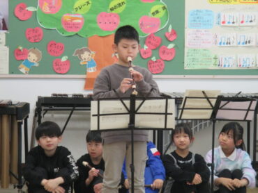 3年生の子供たちが、音楽で学習した曲をリコーダーで演奏するので聴きに来てほしいと招待を受け、音楽室でリコーダーの演奏を聴かせてもらいました。一生懸命に演奏している姿が印象的でした。