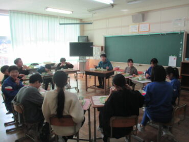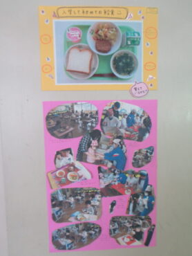 また、廊下には、1年生が初めて給食の準備をしているときの写真が掲示してありました。小規模校ならではの、調理員さんの温かな愛情いっぱいの給食や心遣いに、子供たちもとても嬉しそうでした。