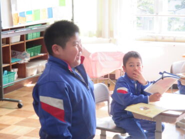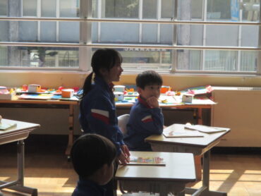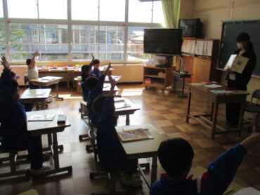 1年生は、国語の時間でした。言葉のきまりのドリルを復習している際に、「これはなんでしょう」のクイズがあったので、子供たちは、先生が出した問題に楽しく答えていました。