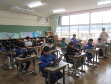 4年生は、外国語活動の時間でした。これまで学習してきた内容を振り返るために、先生がクイズ形式で問題を出し、子供たちは学習専用端末を使って答えていました。端末の画面に問題が表示されると、子供たちは、瞬時に答えていました。