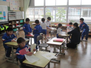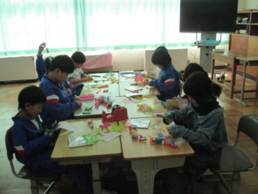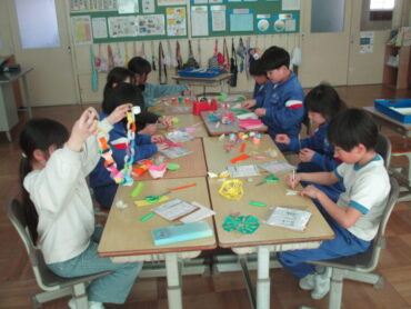 2年生は、教室とのお別れ会に向けて、教室の飾り作りをしていました。色紙を切ったり貼ったりしながら、楽しそうに準備を進めていました。これまで過ごしてきた教室への思いを込めて、一生懸命取り組んでいました。