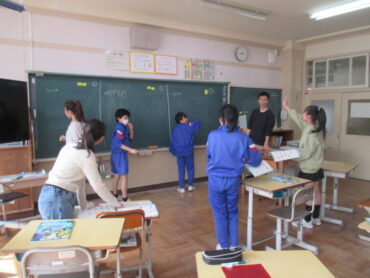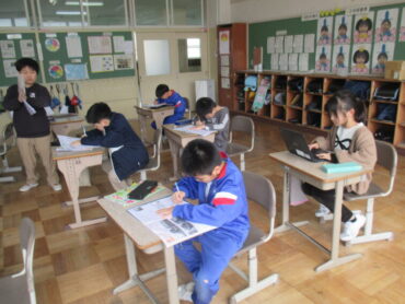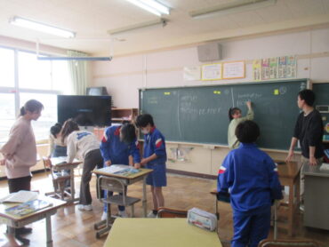 5年生は、外国語の時間に3つのグループに分かれて「英単語しりとり」に取り組んでいました。これまで習った英単語を書き、その単語の最後のアルファベットから始まる別の英単語をつないでいく活動です。子供たちは、綴りの順番を教え合ったり、教科書を確認したりしながら、協力して楽しそうに学習していました。
